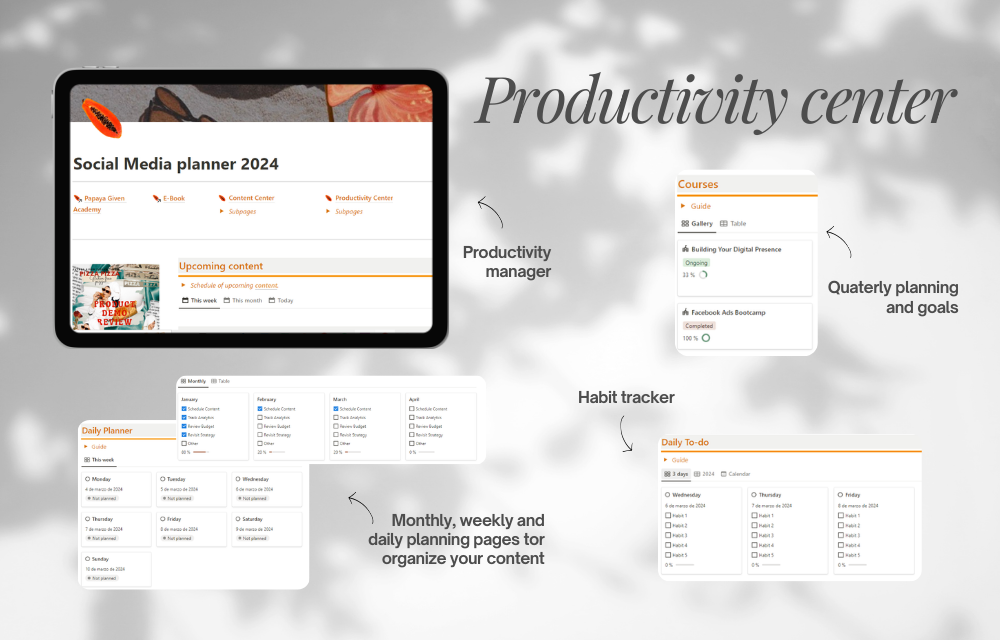 Say hello to the Papaya Given Agency Kit β your new best friend for smoothing out the chaos of running your biz. Whether you're in marketing, cooking up creative content, or hustling for growth, this Notion template is your one-stop-shop for keeping all your stuff in line. From projects to clients, finances to goals, it's got you covered. Stay on top of your game, never miss a beat, and rock your influencer journey like a pro with our Agency Kit! π